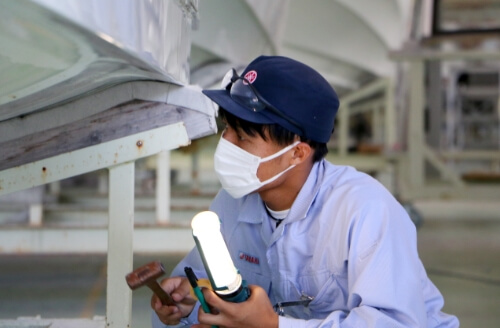 品質保証部に所属し、主に船体の完成検査、走行テスト、タンクの圧力検査、部品等の不具合チェックなどの検査業務を行っています。